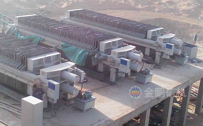 浸出槽最后的尾礦經(jīng)緩沖槽由泵輸送到全自動(dòng)廂式壓濾機(jī),壓濾后的水流入循環(huán)水池以備循環(huán)利用,濾餅經(jīng)帶運(yùn)輸機(jī)運(yùn)到尾礦堆場(chǎng),卡車將尾礦運(yùn)到尾礦庫(kù)。