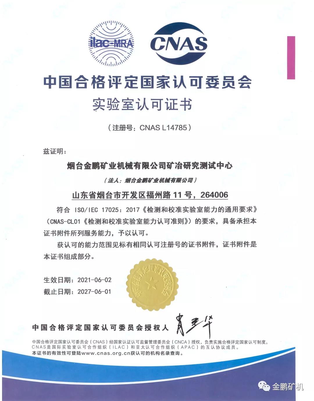 碩果源于奮斗 創(chuàng)新彰顯實力——熱烈祝賀金鵬礦機礦冶研究測試中心通過CNAS認(rèn)證