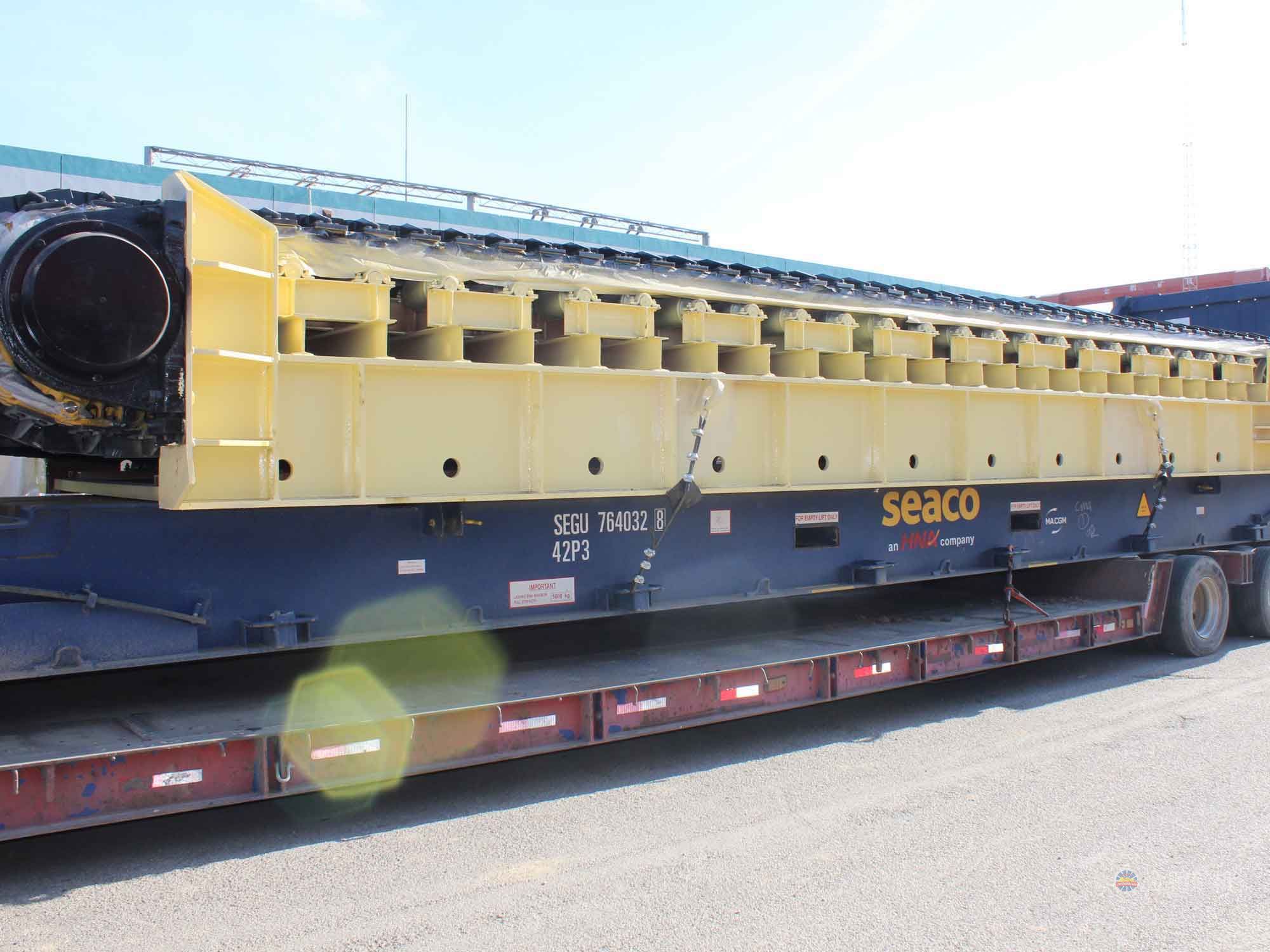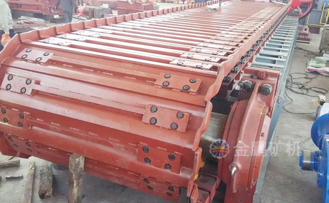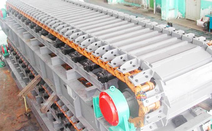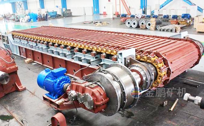 采用節(jié)距為200mm的高強(qiáng)度模鍛鏈條為牽引件,兩根鏈條繞過安裝在機(jī)體頭部的一對驅(qū)動鏈輪和機(jī)體尾部的一對張緊輪聯(lián)成封閉形回路,在兩排鏈條的每個鏈節(jié)上裝配了相互交迭的、重型結(jié)構(gòu)的輸送槽而成為一個連續(xù)的能夠運(yùn)載物料的輸送線路。其自重和物料的重量由安裝在機(jī)體上的多排支重輪、鏈托輪和滑道梁支承。傳動系統(tǒng)經(jīng)交流變頻調(diào)速電動機(jī)聯(lián)接減速機(jī),再由漲套與驅(qū)動裝置直聯(lián)驅(qū)動運(yùn)載機(jī)構(gòu)低速運(yùn)行。將尾部料倉卸入的物料沿輸送線路運(yùn)至機(jī)體的前方排出,實(shí)現(xiàn)向下方的工作機(jī)械連續(xù)均勻喂料的目的。