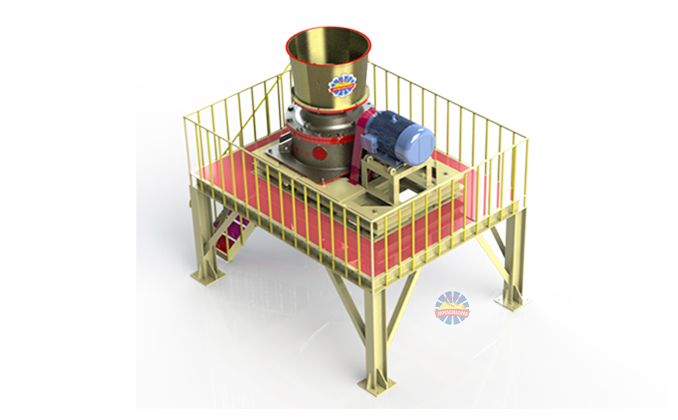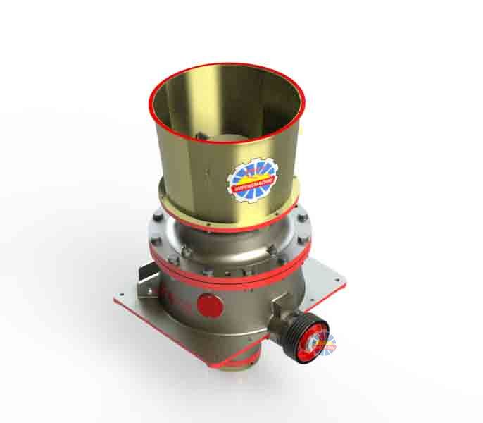 PYY圓錐破碎機工作時:電機帶動破碎機的小齒輪,小齒輪帶動大齒輪,大齒輪組件(大齒輪、大齒輪架、偏心鋼套)帶動偏心套組件(偏心缸套、偏心銅套)和主軸組件(主軸、內(nèi)錐、內(nèi)錐襯板)以理論垂直線為中心,在銅襯套內(nèi)公轉(zhuǎn),主軸組件在偏心銅套內(nèi)以主軸的中心線可以實現(xiàn)自轉(zhuǎn)。空機運行的時候,偏心套組件“抱著”主軸組件和隨大齒輪一同公轉(zhuǎn),當物料加入到破碎腔后,主軸總成(主軸、內(nèi)錐)在物料的阻力下在偏心銅套內(nèi)緩慢的自轉(zhuǎn)。內(nèi)錐的運行軌跡看起來是在破碎腔內(nèi)來回擺動,同時緩慢的旋轉(zhuǎn)。物料被擺動的內(nèi)錐擠壓破碎。支撐套與架體連接處靠液壓缸壓緊,當破碎機內(nèi)落入金屬塊等不可破碎物體時,單缸的動錐由底部液壓活塞托起,起到排放口調(diào)整和過鐵保護、反復起落排除堵礦的作用。