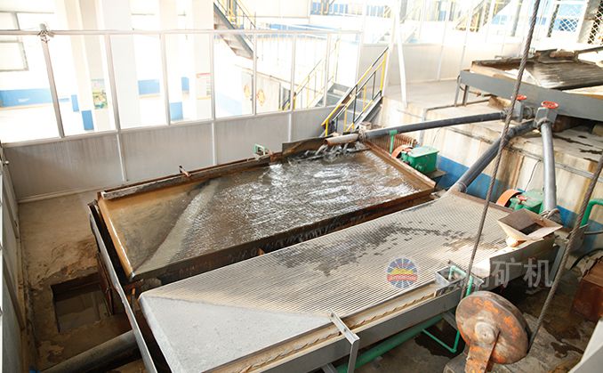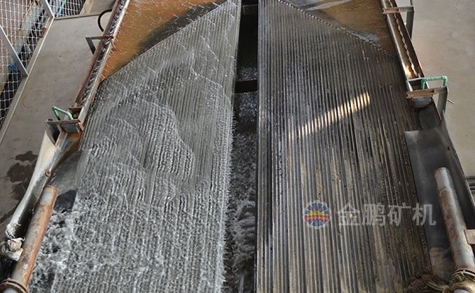 礦粒群從6s搖床床面上角的給礦槽送入,同時(shí)由給水槽供給橫向沖洗水,于是礦粒在重力,橫向流水沖力,床面作往復(fù)不對稱運(yùn)動(dòng)所產(chǎn)生的慣性和摩擦力的作用下,按比重和粒度分層,并沿床面作縱向運(yùn)動(dòng)和沿傾斜床面作橫向運(yùn)動(dòng)。比重和粒度不同的礦粒沿著各自的運(yùn)動(dòng)方向逐漸扇形流下,分別從搖床精礦端和尾礦側(cè)的不同區(qū)排出,最后被分成精礦,中礦和尾礦。